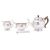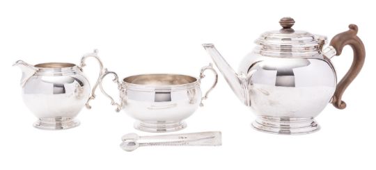 A George VI silver three piece tea service by William Comyns & Sons Ltd, London 1937, of bullet form in the Art Deco style, the stepped dome lid with composite finial, faceted straight spout, S scrolled composite handle, raised on a flared circular base, with a two handledsugar bowl, milk jug and a pair of bright cut sugar tongs, 17cm. (6.6ins.), 1370gms., (44ozs.), gross, (4)