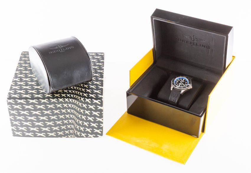 Brietling 1884 SuperOcean gentleman's wristwatch the round black dial having luminous quarter-hour baton numerals, Arabic numerals, luminous hands and sweep seconds hand, date aperture, blue seconds aspect and signed Breitling, 1884, SuperOcean, Chronometre Automatic, 5000FT/1500M, with black rotating outer bezel, with a black rubber Breitling strap, with paperwork including Attestation de Chronometre giving the Montre No. 1345054 and reference A1736402/BA30, warranty certificate dated December 2010, with inner yellow sleeve for papers, black leather watch boxes and outer card box with airplane logo.