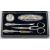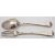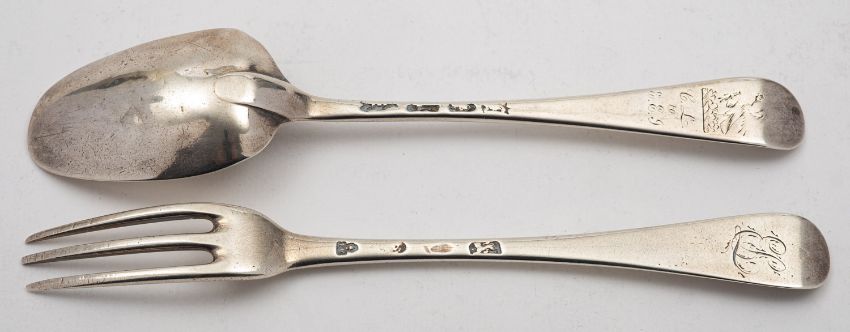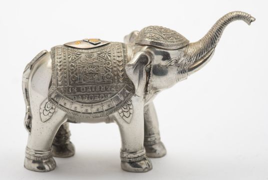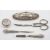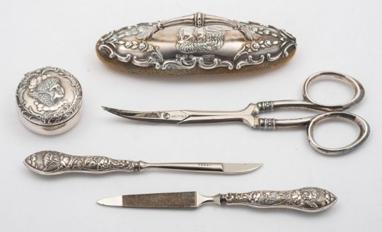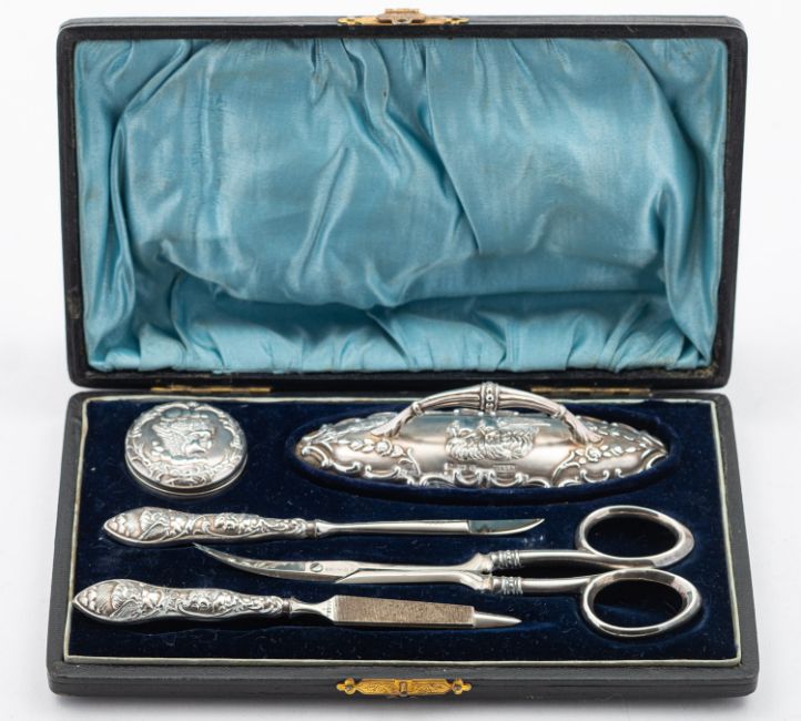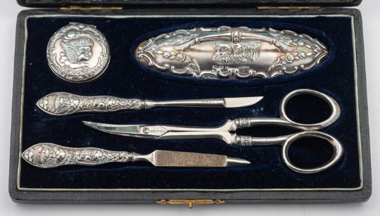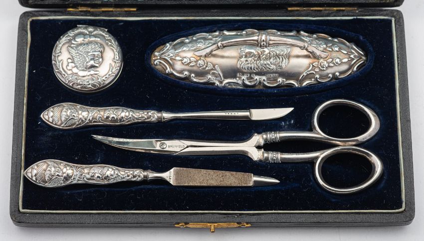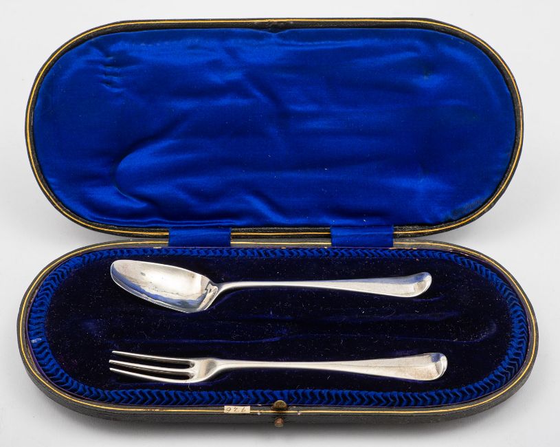 A mixed group of silver items including; a small George II three prong Hanoverian fork by Paul Hanet, London date letter rubbed out, with later engraved initials, a small Hanoverian spoon marks pinched, a pair of cased two handled silver salts by William Hutton & Son, London 1896, of shaped navette form, two matching spoons, a cased three piece silver christening set Birmingham 1858, a cased five piece silver and polished steel manicure set by Adie & Lovekin Ltd and a chrome metal elephant from The Oriental, Bangkok, 67gms, gross