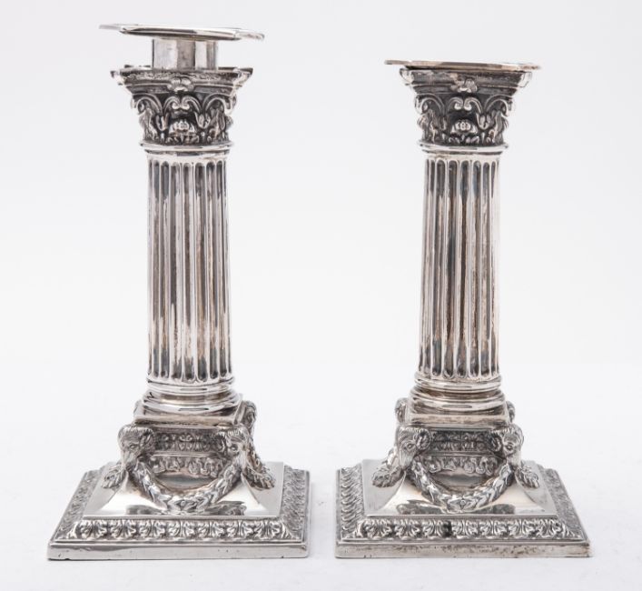 A pair of Victorian silver Corinthian column candlesticks maker's marks rubbed probably by Martin, Hall & Co, Sheffield 1897, in the Adam style, detachable drip pans, fluted columns, set on square concave bases, with sheep head masks and swags, loaded bases, 17cm. (6.6ins.) high