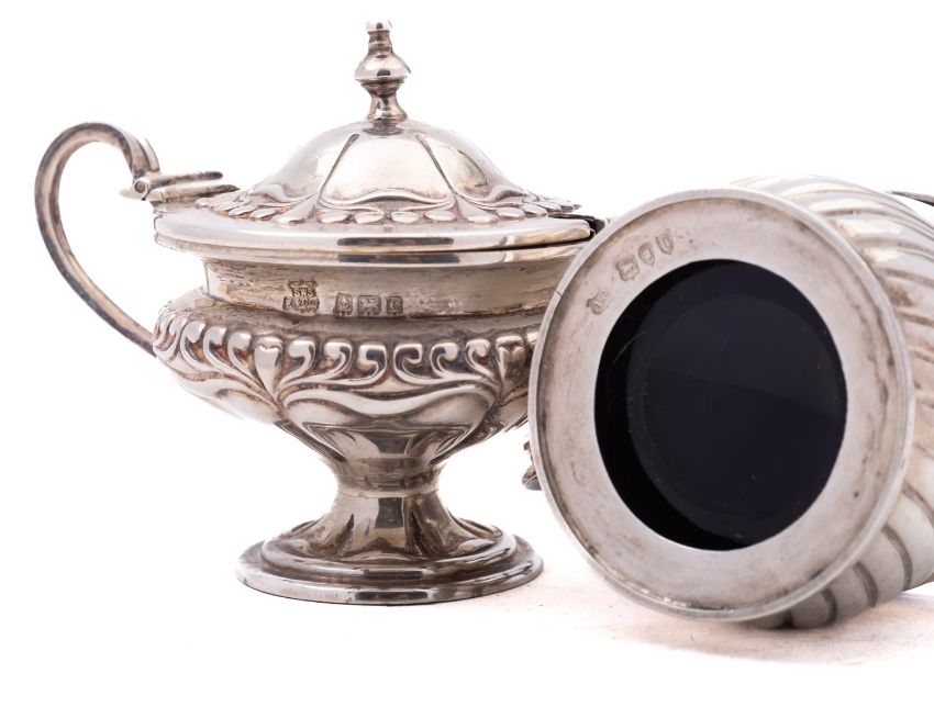 An Edward VII silver Art Nouveau mustard pot by Samuel Walton Smith, Birmingham 1902, with blue glass liner and a small Victorian part swirl embossed mustard pot with blue glass liner, 120gms., (3.8ozs.), gross, (2)