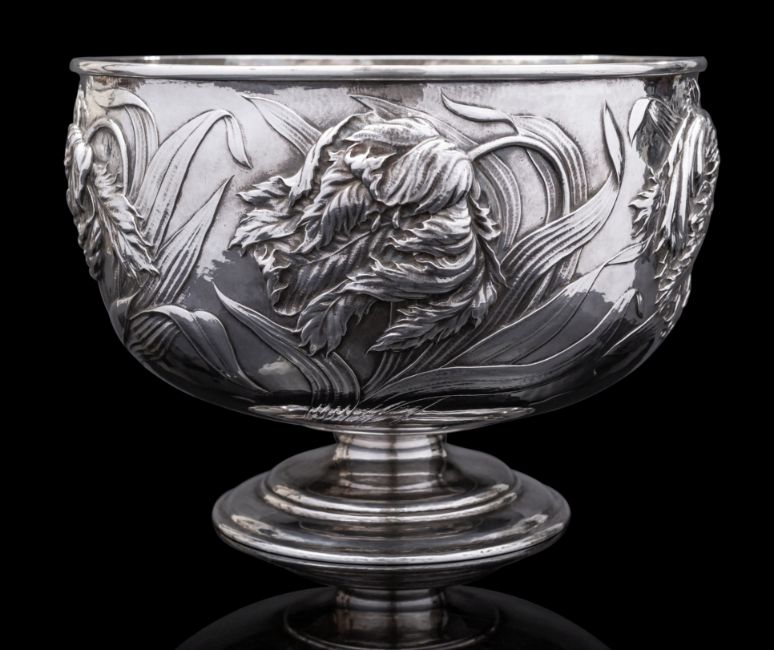 An impressive Arts and Crafts silver punch bowl signed and dated Gilbert Marks '96 by Johnson, Walker & Tolhurst Ltd (Walter Walker & Brownfield Tolhurst), London 1895, straight sided circular form, Parrot Tulips decoration, set on a short stem with a broad spreading base, facsimile signature, 28x20.5cm, (11x8ins.), 1761.8gms., (56.6ozs.) Illustrated in 'The Craft of the Silversmith', The Artist, July 1898, p. 136 Gilbert Marks (1861 - 1905), was an important art nouveau silversmith. Nephew of Henry Stacy Marks and Frederick Walker, marks exhibited regularly at Johnson, Walker and Tolhurst gallery from 1896-1902. Having also exhibited at the Royal Academy and the Fine Art Society it is through that he created around 800 pieces of silver. Renowned for his use of fluid and organic designs. As this bowl was made in 1895/6 and bears Mark's facsimile signature and date '96, it was possibly made for his first exhibition at Johnston, Walker and Tolhurst Ltd in 1896.