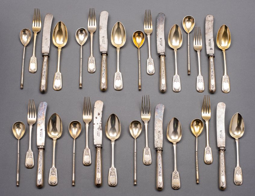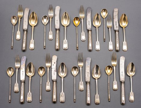 A part canteen of Russian gilt silver and niello flatware by Michael Yakovlev, Moscow 1821-23, comprising eight forks, eight spoons- 17cm. long, eight dessert/ caviar spoons, 830gms., (26.6ozs.), gross, and eight knives with steel blades by J.A.Henckels, Solingen- and loaded silver handles, 20.5cm. long,