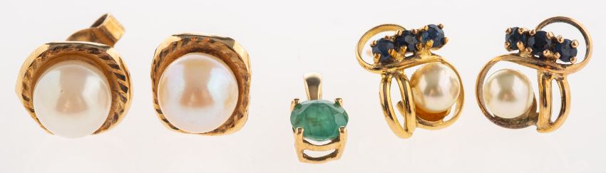 A mixed group of jewellery, including a small pendant set with a circular-cut emerald, bale marked 10k, length approx. 0.9mm, 0.3grams; a pair of flat edged hoop earrings, hooks marked 9k, diameter approx. 1.9cm, 1.2grams; three odd hoop earrings of varying design, hooks marked 375, total gross weight 1.5grams; a pair of earrings, each set with a small cultured pearl and three small sapphires, unmarked, no butterflies, 1.0grams; and a pair of stud earrings, each set with a cultured pearl, unmarked, one butterfly marked 375, 1.2grams, (Qty).