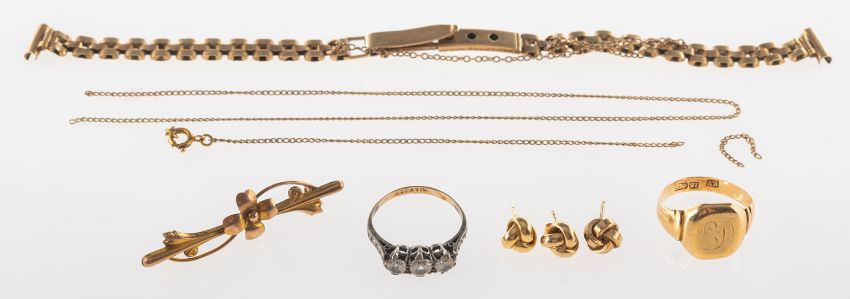 A mixed group of jewellery, including a signet ring with faint monogram, marked 15 .625, size approx. L1/2, (shank bent out of shape), 3.2grams; a watch bracelet with buckle clasp and safety chain, marked 9ct to verso of clasp, length approx. 16.0cm, 7.6grams; a floral bar brooch, indistinct mark 9ct, length approx. 4.2cm, 1.4grams; a small length of broken gilt chain; a pair of knot stud earrings, posts marked 375, one butterfly, marked 375, 0.4grams; an odd knot stud earring, post marked 9ct, 0.0grams; and a three stone ring set with paste stones, marked 9ct & SIL, size M1/2, 1.7grams, (Qty).
