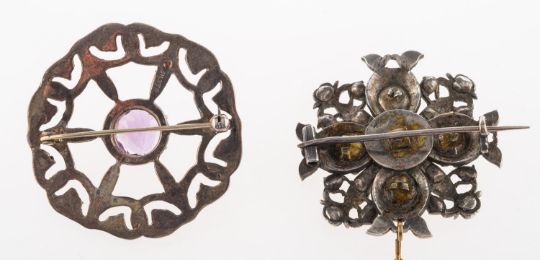 Two brooches, including an openwork Scottish brooch, claw set with a circular-cut purple paste stone, marked silver to verso, diameter approx. 4.4cm, 16.9grams; and an ornate antique brooch set with pink and white paste stones, (some stones missing, enclosed back setting, unmarked white metal, safety chain, diameter approx. 4.0cm, 18.9grams, (2).