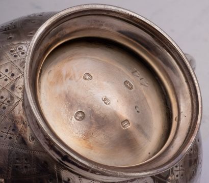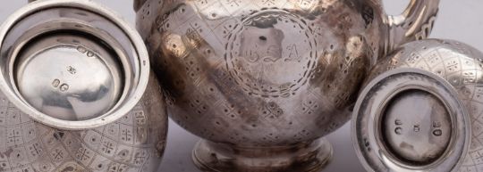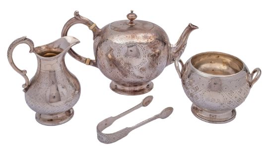 A Victorian silver three piece silver bachelor's tea service by Robert Harper, London 1866, the tea pot of bullet shape with flat hinged lid and cast finial, C scroll silver handle with ivory insulators, acanthus caped spout raised on a flared foot, engraved decoration the cartouche with initials, with a milk jug, sugar bowl and sugar nips, 455gms., (14.5ozs.), gross, (4) Ivory Exemption number: 9Q7RH4V5