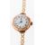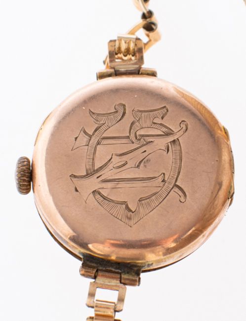 A 9K gold lady's wristwatch having a round white enamel dial with black Roman numerals, blue XII o'clock and blued steel spade hands, the round case stamped within .375 along with an import mark, the movement stamped Swiss Made, with a rolled-gold bracelet, diameter 25mm, gross weight c.16.81gs.