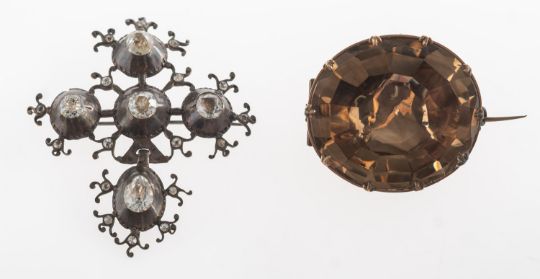 Two antique brooches, including a French Norman 'Croix de Saint Lo' cross brooch pendant set with paste stones (the bottom section being articulated), with brooch pin and pendant bale to verso, unmarked white metal, measuring approx. 7.0cm x 6.0cm, 13.7grams; and a large brooch set with a large oval-cut yellow stone, enclosed back setting, unmarked metal, measuring approx. 4.4cm x 3.8cm, 43.3grams, (2).