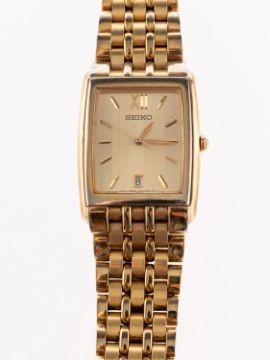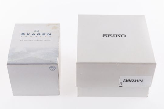 Seiko, a gold-plated wristwatch, the gilt pin-stripe rectangular dial having raised gilt baton numerals, dauphine hands, a sweep seconds hand, date aperture and signed Seiko, the rear of the case stamped 291926, 7N-32-0BA0, Stainless Steel, with integral gold-plated bracelet, diameter 28mm, complete with boxes, booklet and guarantee.Skagen, a stainless-steel gentleman's wristwatch, the black dial with raised steel baton numerals and hands, and signed Skagen, Denmark, Steel, the case rear stamped 233LSS B, with integral stainless-steel mesh bracelet, diameter 38mm, complete with boxes and paperwork.