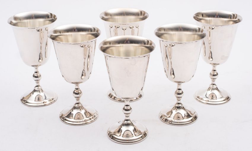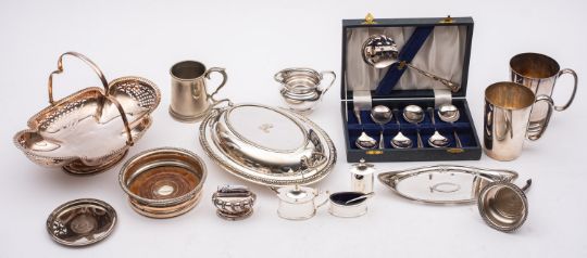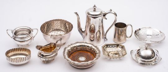 A mixed group of silver plate including; a Mappin and Webb rose bowl, a set of six goblets, three beer mugs, a swing handle bread basket, two coasters, a butter dish and cover, a snuffer tray, a coffee pot, wine funnel, a three piece cruet set and other items, (a lot)