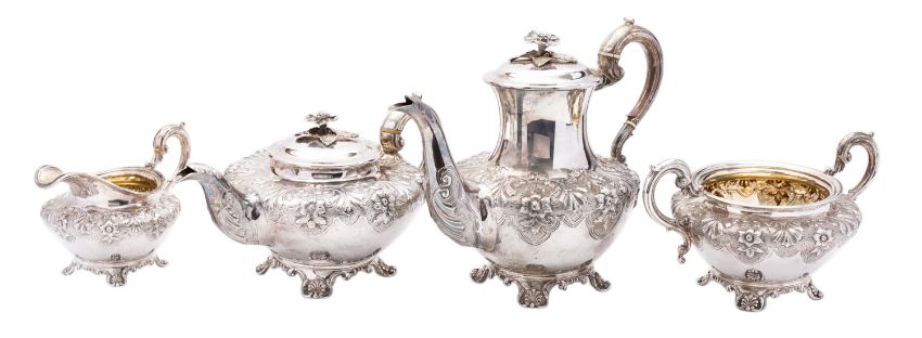 A William IV four piece tea and coffee service by Richard Pearce & George Burrows, London 1834, of baluster form, domed hinged lid, cast flower finial, high C scroll handle, ivory insulators, raised, chased and engraved floral panels, set on four shell bracket feet, comprising a tea pot, coffee pot, two handled sugar bowl and milk jug, engraved crest, 22cm., (8.6ins.) high, 2247.2gms., (71.8ozs.), gross, (4)Tea Pot Ivory Exemption Number: 5FM2N8M9Coffee Pot Ivory Exemption number: B2AD73ER