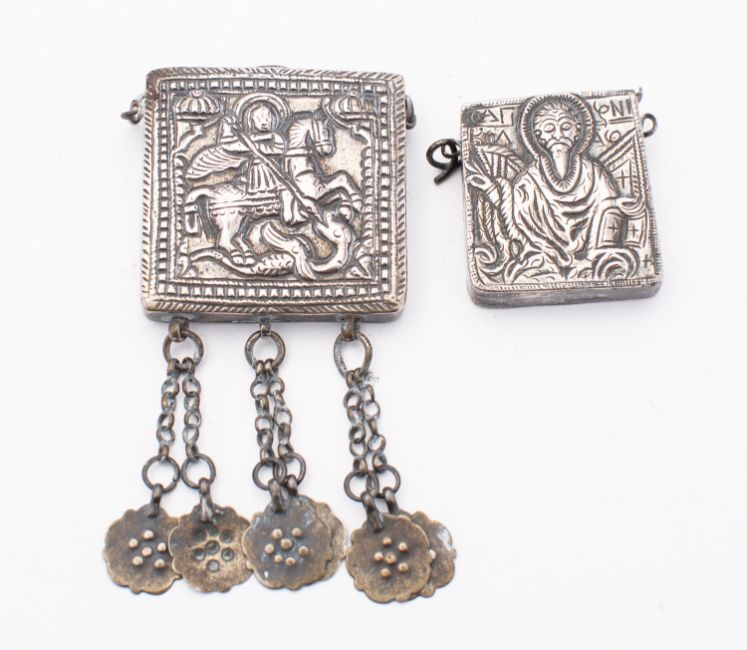 An early 20th century silver Orthodox Christian Ladanka of Saint Nicholas, probably Russian, with another similar of St George slaying the dragon, not marked, 119gms., (3.8ozs.), gross, (2)