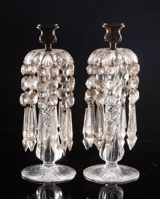 A pair of clear glass table lustres with star cut circular foot, waisted wrythen shaft supporting a petal shaped crown supporting prisms and pendants, surmounted by a gilt brass sconce, 35cm high, [small chip to foot].