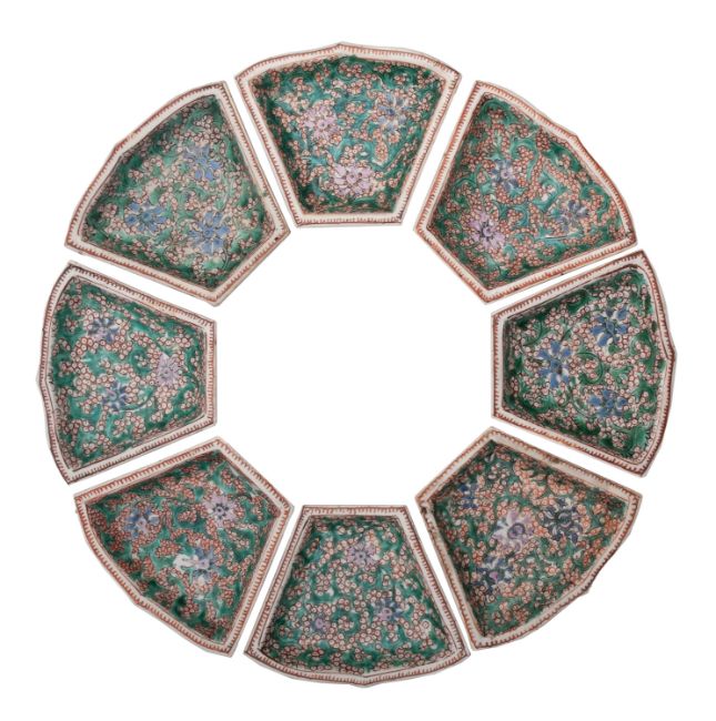 A Chinese famille rose hors d'ouvres set, late Qing/Republic of nine pieces, the segments enamelled with scrolling flowers and foliage around the central yellow-ground dish, the whole 37cm wide [minor damages].