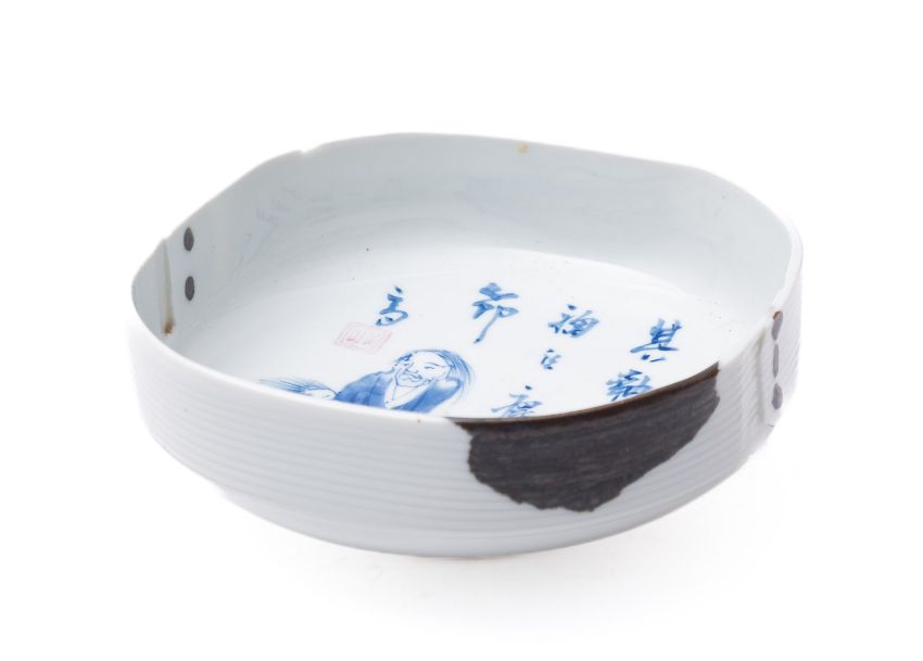 A Japanese Arita porcelain bowl, Meiji period of pleated basket form, the interior painted by Shozan in blue with the two Chinese eccentrics Hanshan and Shide [Kanzan and Jittoku in Japanese] one holding a scroll, the other a broom, together with a Chinese poem about them, red seal for Shozan, the underside with seal stamp 'Kotobuki', 17cm [rim chip].