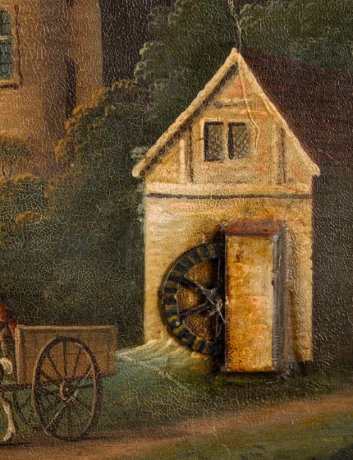 A Victorian automata clock, being a painting of a church in a landscape setting with a working clock within the spire and moving waterwheel and windmill sails all running of a watch movement having a thirty-hour, singe-fusee, the watch backplate engraved with the makers name Thos. Brown, Birmingham, 47260, all in a maple wood frame, dimensions 72 x 54 cm.