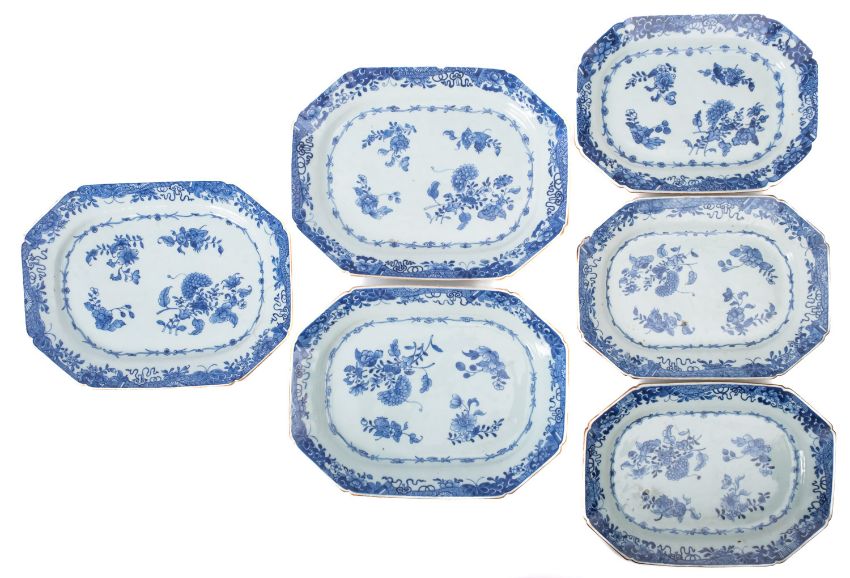 Six Chinese porcelain meat plates of octagonal form painted in blue with scattered blooms within a diaper border, Qianlong, 35 and 31cm long, [some rim chips].