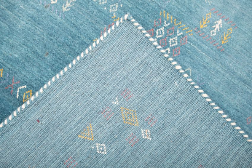 A Contemporary wool rug, the pastel blue field with geometric designs and lozenge motif border, 245cm x 154cm.