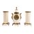 A French gilt-metal and white pottery three-piece clock garniture the eight-day duration movement striking the hours and half-hours on a bell with an outside countwheel, the cast-brass dial having black Roman numerals to the individual enamel plaques, with blued-steel spade hands, the urn shaped crackle-glaze pottery case with gilt-metal fish handles to the sides, surmounted by a pineapple finial and on matching feet, with matching side-pieces, height 43cm clock, 33cm side pieces.