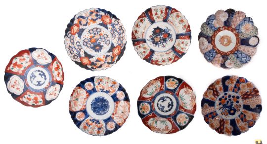 A group of Japanese porcelain, comprising an Arita lobed bottle vase enamelled with a pair of landscape panels reserved on a scrolling ground containing song birds, 25cm high, together with seven various Imari plates [two with damages].