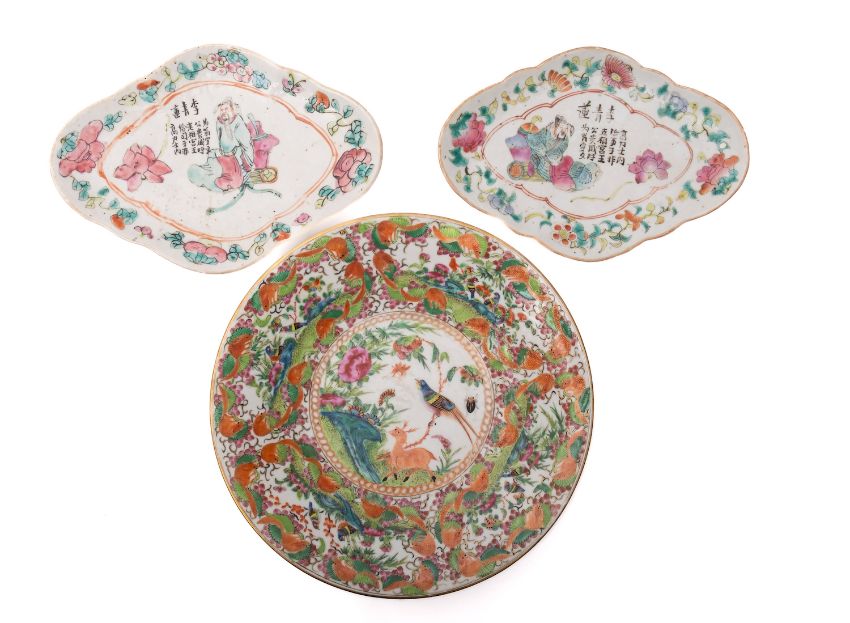 A Chinese Canton famille rose dish, late Qing dynasty and a pair of Wu Shang Pu lozenge-shaped footed dishes the first enamelled with squirrels, birds, a large insect and a deer amongst flowers and foliage, 24cm; the pair of dishes decorated with figures, inscriptions and floral sprays, 20cm [3]..