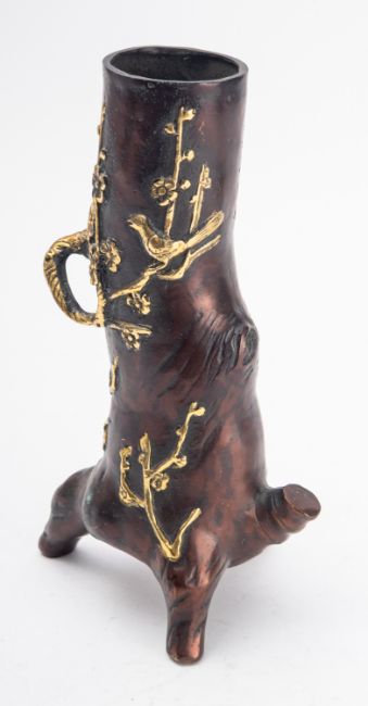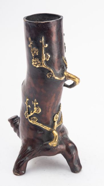 A Japanese bronze vase in the form of a tree trunk inlaid in gilt with flowering prunus and a songbird and verso with the text Xi shang mei shao [joy on the tip of the plum blossom branch], 20cm high, four character mark to base, Meiji.