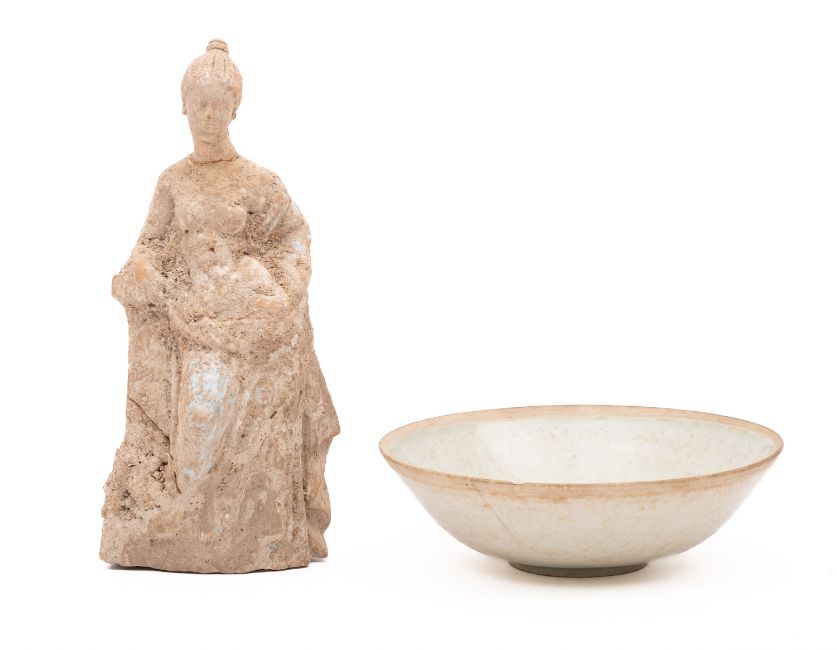 A Chinese Qingbai bowl and a Greek terracotta figure the bowl incised to the exterior with flower-heads, Song Dynasty, 16.5cm [crack to rim]; the female figure standing by a column, 21cm [some damage] 2.