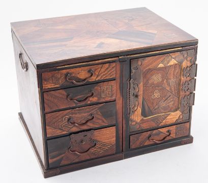 A Japanese parquetry Kodansu, Meiji period one side with four graduated drawers, the other with a panelled door enclosing two drawers with one further below, 39cm wide.