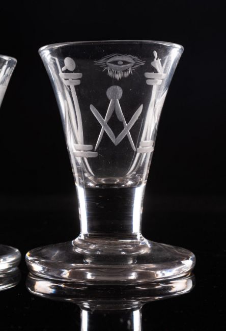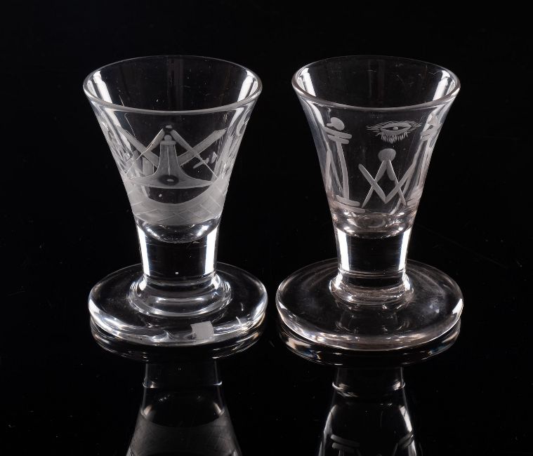 Two Masonic firing glasses with trumpet shaped bowls, stout rudimentary stem and thick foot each engraved with Masonic symbols, 9 and 9.5cm high, late 18th/early 19th century.