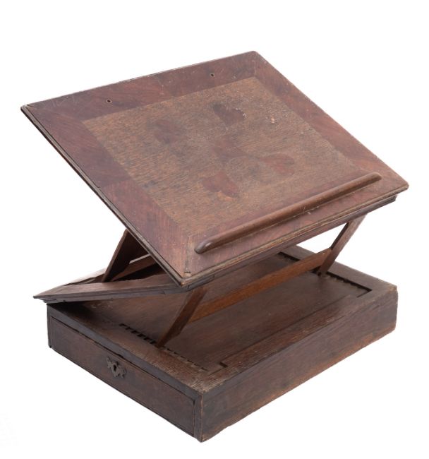 A George II oak and walnut marquetry writing and reading stand, circa 1740; the top with heart motifs and crossbanded borders rising on hinges at each long side, with rack and ratchet strut supports; the box base with drawer at one end; 11cm high, 47cm long, 36cm wide