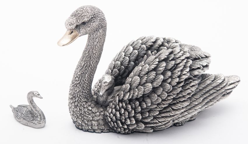 A late 20th century silver covered resin figure of a swan and cygnet, by Country Artist, Birmingham 1997, with copyright stamp, (2)