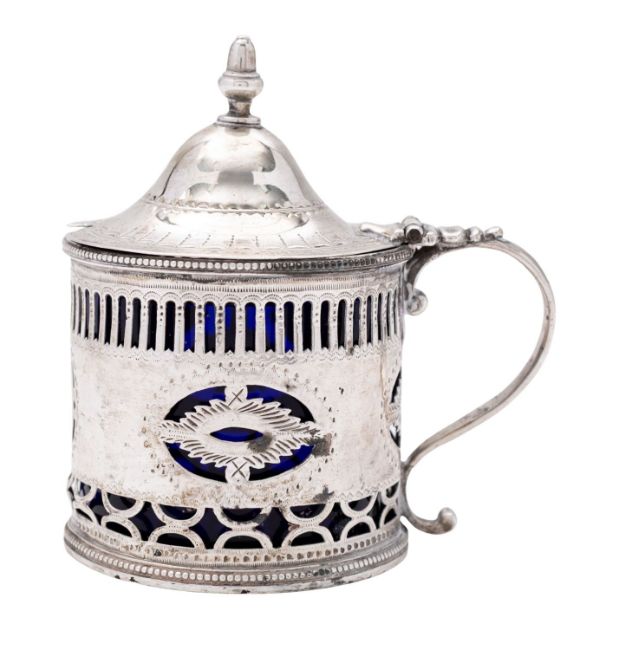 A George III silver mustard pot, of circular form, with bead borders and a pierced body and bright-cut decoration, the domed hinged lid with an acorn finial, replacement glass liner, by Charles Hougham, London 1787; 3.5" (8.8cm) high; 2.6ozt