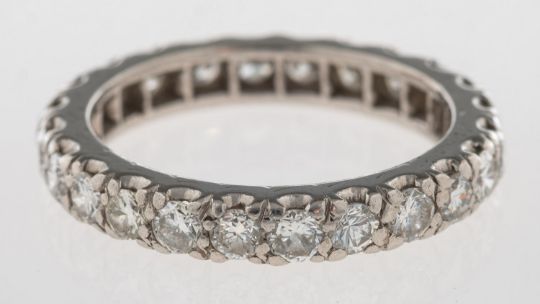 A full diamond eternity ring, set with twenty-four brilliant-cut diamonds in a scallop setting, each diamond being approx. 0.05 carat, diamonds approx. 1.20 carats total, unmarked white metal, size approx. L, 5.6grams.