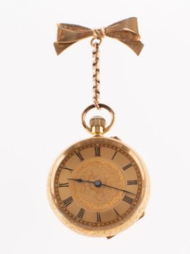 A lady's 18K gold open-faced pocket watch with a 9K gold bow the gold dial with matted and engraved centre, black Roman numerals and blued-steel spade hands, the Swiss bar movement having a lever escapement and Breguet overcoil to the hairspring, the fully engraved case stamped within 18K with the Queen's Head, repeated to the inner cuvee, the attached bow hallmarked for London 9K gold, diameter 37mm, gross weight 42.98gs.Complete with wooden presentation box.