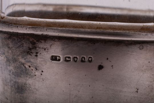 A Victorian silver mounted clear glass spirit flask, shaped oval, with a faceted upper body, screw-off cover and pull-off drinking cup, crested with a Ducal Coronet and initialled, by Frederic Purnell, London 1876; 5.8" (14.9cm) high; 3.25ozt