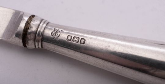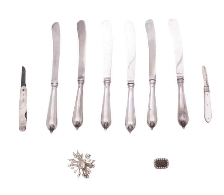 A George V set of six silver dessert knives, with loaded handles and steel blades, by Thomas Bradbury & Sons Ltd, Sheffield 1916, together with a Victorian hair brooch, a paste-set brooch, a folding fruit knife and a silver mounted multi-tool (steel blades), mixed makers & dates; the knives 7.5" (19.1cm) long (10)