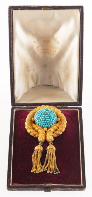 A Victorian Etruscan revival turquoise and diamond brooch, an ornately designed gilt brooch of two highly carved rope twists, each terminating with a tassel drop, the centrepiece raised bombé is set with multiple turquoise cabochons and star set with a single old-cut diamond, a glass keepsake compartment to verso, pin and safety catch fitting, length approx. 8.0cm, 23.5grams; accompanied by its original fitted red velvet lined case, marked inside 8 Donegall Place, James Neill & Co, Goldsmiths, Belfast.