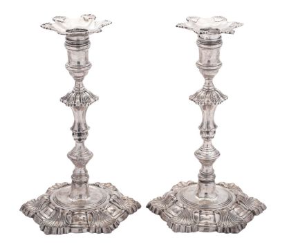 A pair of George II cast silver candlesticks, on shaped circular bases with shell decoration, with knopped stems, spool-shaped capitals and detachable nozzles, each with engraved coat of arms in the wells and incised with their scratchweight to the bases, by Hugh Mills, London 1751; 9" (23cm) high; 40.1ozt (2)Provenance - Lawrences of Crewkerne - Lot 534 - 15/01/2019.