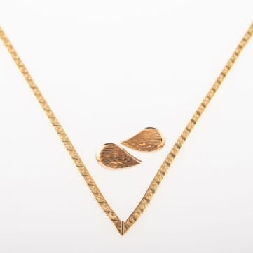 A necklace and a pair of earrings, a 'V' shaped flat herringbone style necklace with a polished and textured finish, the necklace has been lengthened each side to the clasp with rigid sections, UK import mark 375 to clasp, length approx. 45.0cm, 6.3grams; and a pair of 'tear drop' shaped stud earrings with a polished and textured finish, posts marked 9ct, butterflies unmarked, length approx. 1.5cm, 0.9grams, (2).