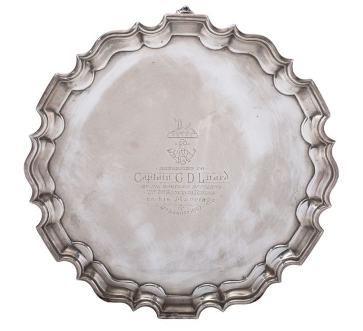 A Victorian silver salver with a moulded border, on three scroll legs and engraved in the centre "Presented to Captain G.D. Lund, by this brother offices 2nd Bt. Scottish Rifles on his marriage 4th August 1897", by Goldsmiths & Silversmiths Co. Ltd, London 1897; 12" (30cm) diameter; 37ozt