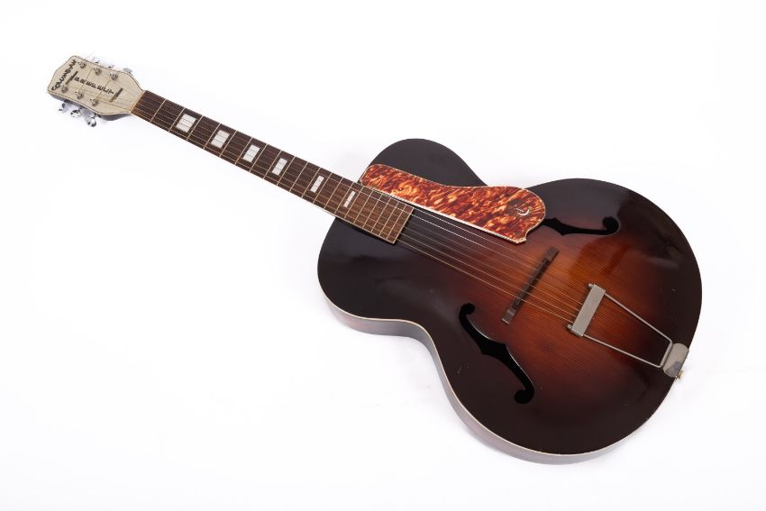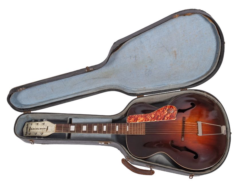 A 1930s Columbian Prefect archtop guitar, with simulated mother of pearl headstock signed as per title , mother of pearl fret markers and simulated tortoiseshell scratch plate in original case.