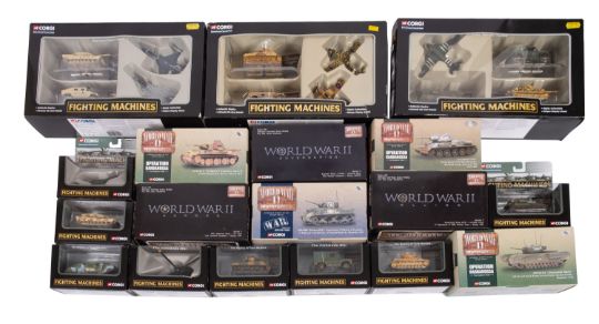 Three Corgi Toys Fighting machines military diecast sets. Together with a collection of Corgi military vehicles including Tanks, Trucks and Aircraft etc all boxed.