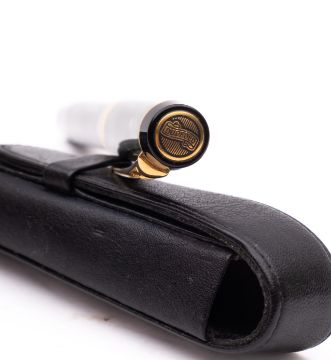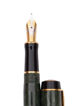 A Parker Duofold fountain pen, in green marble with gilt clip and double banded cap 18K 750 nib, together in a black leather pen case.