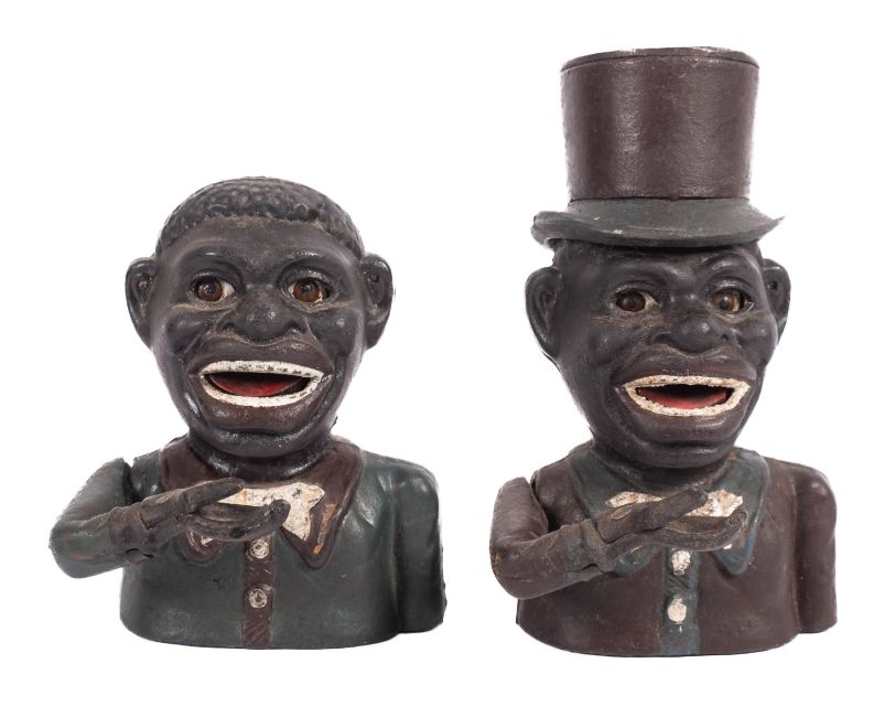 Two early 20th Century American cast iron money banks. Having mechanical arms and dressed in suits, one with top hat, largest 21cm high.