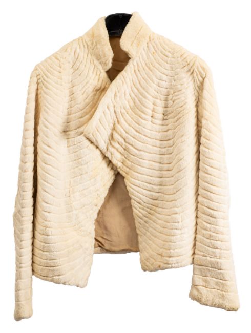 Two lady's faux fur coats, comprising one brown with silk lining and the other white with composite lining, together with a beaded purse.