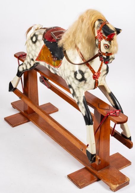 A 20th century painted rocking horse, in black and white with white mane and tail, painted eyes and open mouth with leather tack, raised on a stile base, 117cm high