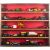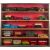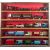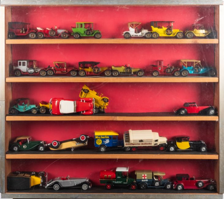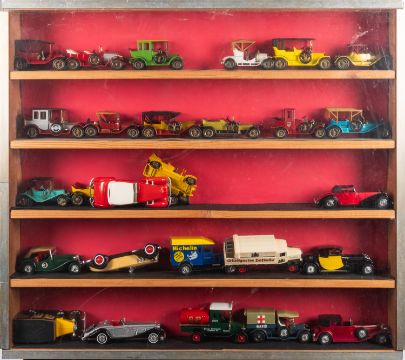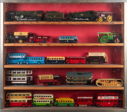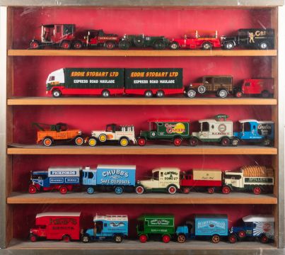 A collection of diecast vehicles in three display cabinets. Comprising Corgi, Matchbox and Lledo lorries, cars and buses etc, contained within three perspex fronted pine display cases with hooks for wall mounting, 55cm high x 58cm wide.