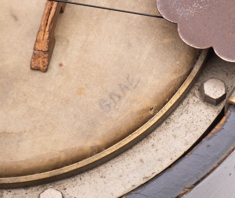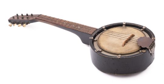 An early 20th Century Banjo. Having an ebonised wooden frame with metal pot and velum head, 55cm long.