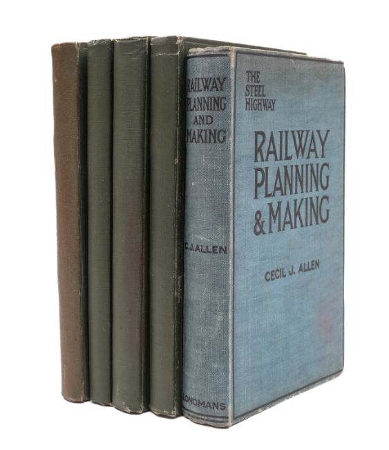 ALLEN, Cecil J. Railway Planning and Making, 2nd impression, London: Longmans Green and Co. 1928, col. frontis., b&w plates, orig. black-lettered blue cloth, 8vo; together with... THE RAILWAY MAGAZINE. 4 vols., for 1942-1946, nd, green cloth gilt, 8vo. (5)